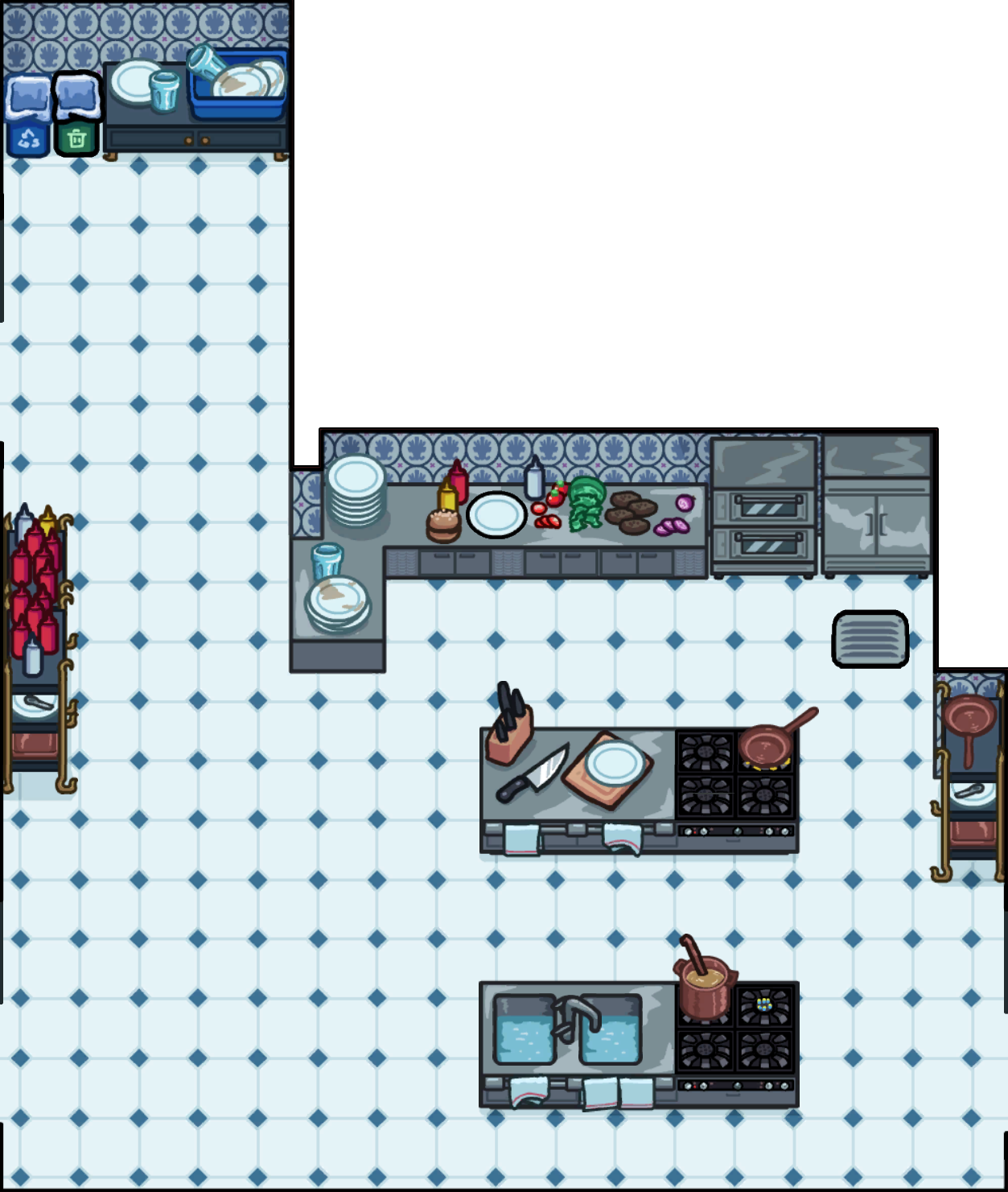 Кухня — это средних размеров помещение в юго-западной части карты. Пол в ней выложен белой плиткой, а стены — голубой. В правой, «основной» части стоят столешницы с кетчупом, ингредиентами для приготовления бургеров и посудой, а также холодильники с продуктами. Ниже находятся два разделочных стола с поварскими инструментами, причём нижний переоборудован в пару раковин для мытья посуды. Оба стола совмещены с плитами, на которых что-то готовится в сковороде и кастрюле. В левой верхней части помещения стоят стойка для грязной посуды и мусорные вёдра.