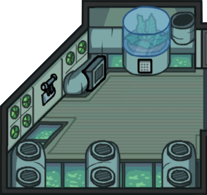 Здесь это маленькое помещение со множеством труб, выходящих из резервуара с жидким кислородом, который находится под полом по всему периметру комнаты. На стене есть маленькие вентиляторы, перегоняющие жидкость из резервуара, под стеклом в верхней части спрятано растение, которое, судя по всему, вырабатывает кислород на космическом корабле.