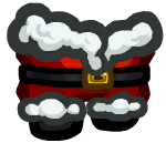 The Heeeere's Santa! is a red suit with white trims lining the top and the hem of each leg. A black belt with a golden buckle encircles the midsection, and the legs end in black shoes.