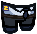 The Pilot's License consists of a white shirt with a golden fringe and a black tie, as well as belted pants and black shoes.