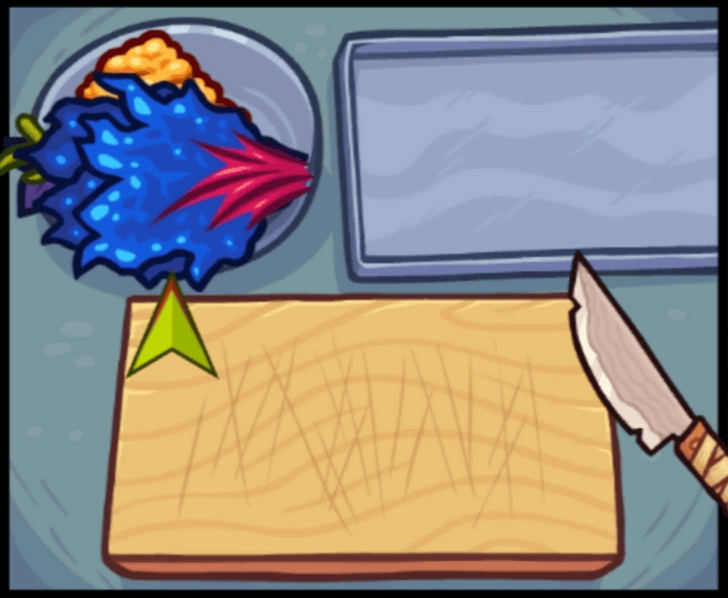 The second stage, located in Kitchen, requires the player to chop up the collected vegetables. They must tap on the top vegetable to bring it onto the chopping board, and then tap it again two or three times in order to cut it sufficiently. Once this is done for all three vegetables, the task is complete.