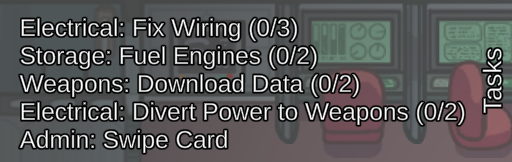 For each Impostor, a list of fake tasks will appear in the screen's top-left corner—the same location as Crewmates' task lists. This list is used to help An Impostor act as a Crewmate when pretending to complete tasks. The fake task list will also inform Impostors of all common tasks given to the Crewmates, helping them lower their chances of being caught. Fake tasks cannot be done. In Reactor on The Skeld, there is a 'task' that appears to be for Divert power, but is impossible to complete. Another such dummy task can be seen on Polus in the Office, despite the fact that Divert Power is not an available task on the map. Three panels of Fix Wiring 'tasks' in Armory, Communications, and Vault on The Airship are also presented as dummy tasks and cannot be done. There is a bin for an Empty Garbage 'task' is located in Lounge near the stalls.