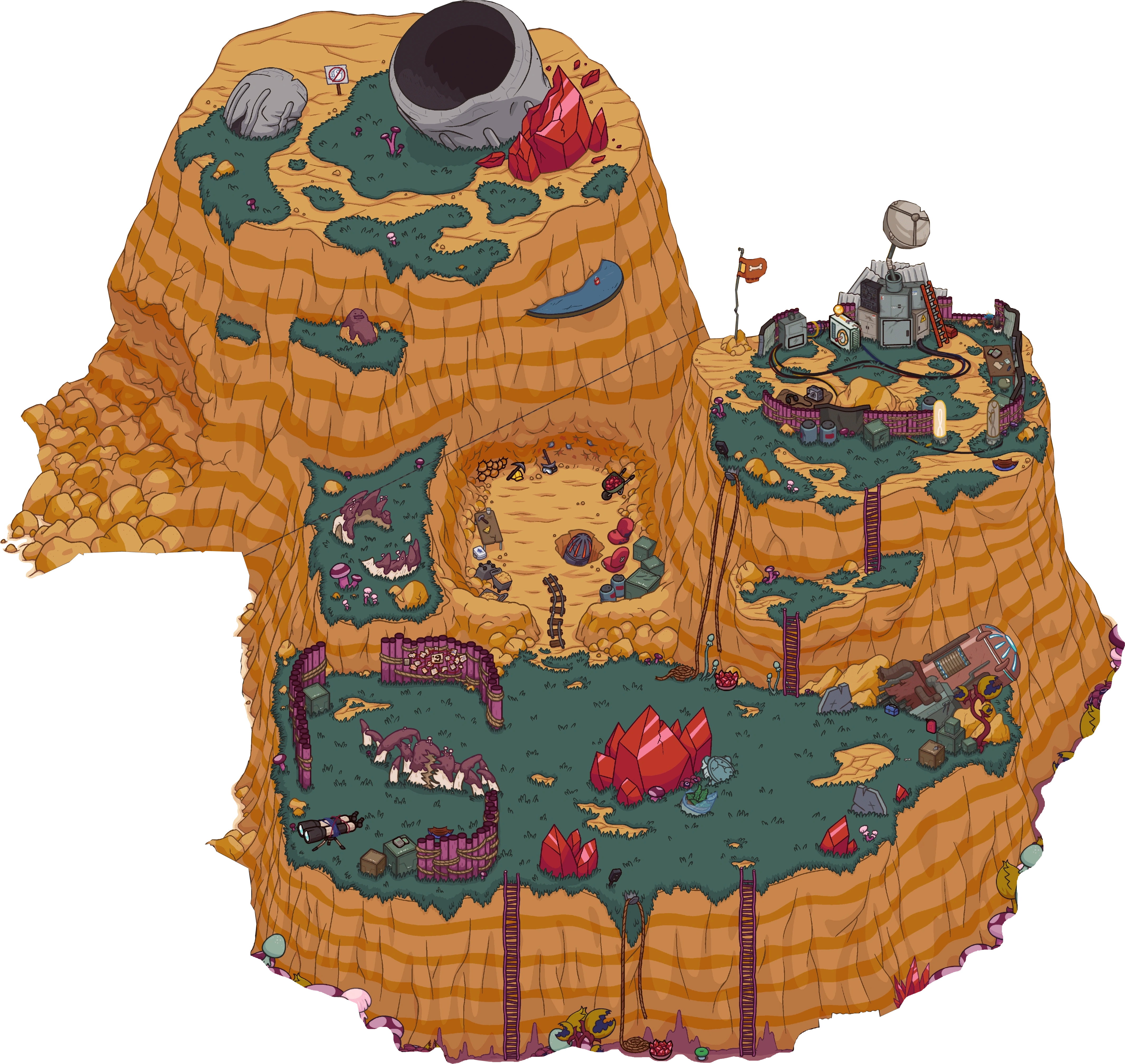 - A small cliff shelf, protruding between the plateau and clifftop. It connects the two larger subregions by ladders and a vent.